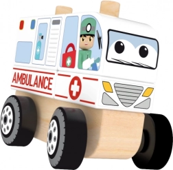Construiți-vă propria ambulanță din lemn și exersați abilitățile în același timp. Cuburile colorate se înșiră pe 2 tije solide, pe șasiul cu roți – asamblarea simplă, pas cu pas, susține concentrarea și răbdarea.