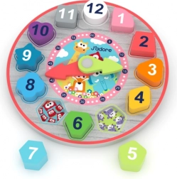 Un puzzle colorat din lemn în formă de ceas îi ajută pe copii să învețe într-un mod jucăuș numerele, orele și minutele, dezvoltând totodată motricitatea fină și percepția culorilor. Fiecare număr are o piesă detașabilă, pe care copiii o pot prinde ușor și o pot plasa la locul corect.
