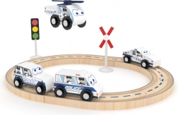 Setul conține în total 16 piese, inclusiv șine și vehicule de poliție, care se pot asambla ușor și pot fi extinse cu alte seturi din lemn.