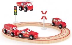 Pachetul include 16 piese, printre care șine din lemn și vehicule cu motive de pompieri. Copiii pot construi propriile trasee și inventa povești care le dezvoltă imaginația și abilitățile sociale.