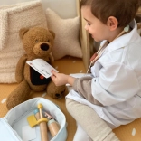 Stetoscop, termometru, seringă, panou pentru testul de vedere și alte accesorii din lemn de calitate susțin un joc sigur și inventiv.