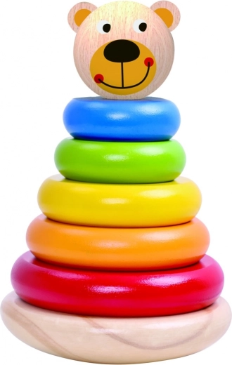 Acest turn de stivuire din lemn cu motiv de urs este ideal pentru primele jocuri de construcție. Copiii înșiră discuri din lemn colorate pe țăruș și învață să recunoască mărimile și culorile. Jocul dezvoltă motricitatea fină, gândirea logică și capacitatea de concentrare.