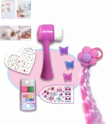 Un studio de coafură adorabil pentru micile cochete oferă ore întregi de distracție creativă. În set găsiți creioane-cretă colorate pentru păr, un elastic cu șuvițe colorate, clame mici în formă de fluture, pietricele decorative, o periuță de curățare pentru ten și autocolante. Cadoul ideal pentru copii până la 6 ani.