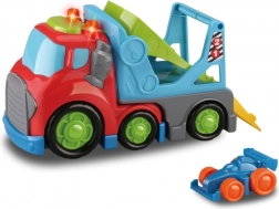 Camionul de transport Kiddy Go! îi va încânta pe micii șoferi: oferă efecte luminoase și sonore activate prin butonul de pe acoperișul cabinei, roți pe liber, iar în pachet găsiți și o mică mașinuță. 2× baterii AA sunt incluse, jucăria este potrivită de la 18 luni.