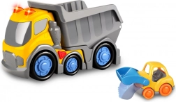 Setul distractiv Kiddy Go! aduce un camion robust cu dimensiunea de 31 cm și o mașinuță pentru și mai multă joacă. Vehiculul oferă efecte luminoase și sonore activate prin butonul de pe acoperiș, benă basculantă și roți cu rulare liberă. 2× baterii AA sunt incluse în pachet. Potrivit de la 18 luni.