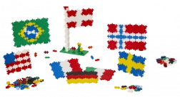 Plus-Plus box Steaguri oferă un stoc generos de piese de construcție pentru a crea motive colorate și steaguri naționale. Datorită broșurii cu șabloane concrete și sarcini, copiii se pot apuca ușor de joacă, care susține motricitatea fină, gândirea logică și creativitatea.
