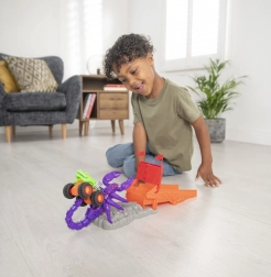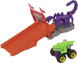 Setul include o rampă portocalie şi un obstacol violet în formă de scorpion, care asigură distracţie şi aventură de neegalat.