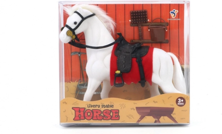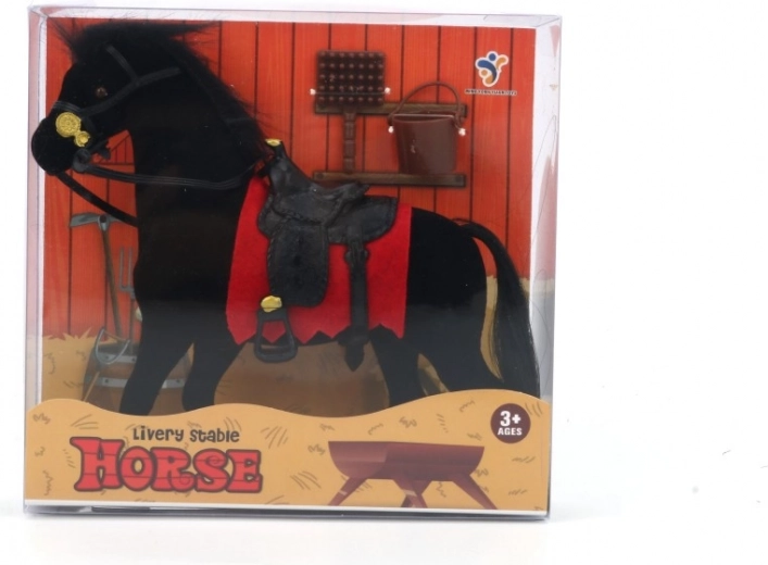 Setul include un căluț cu o bază roșie și șa, completat cu o găleată maro și o perie care sprijină jocul imaginativ.