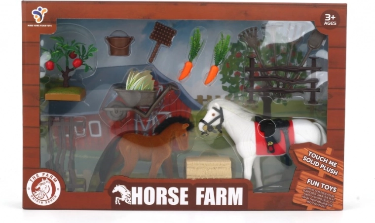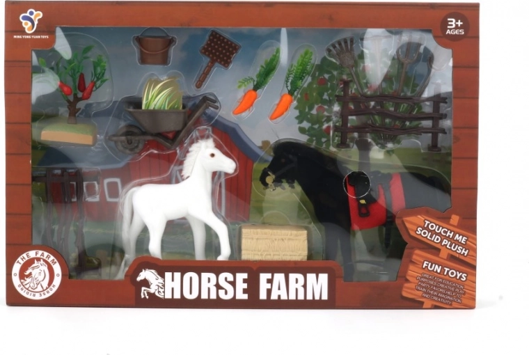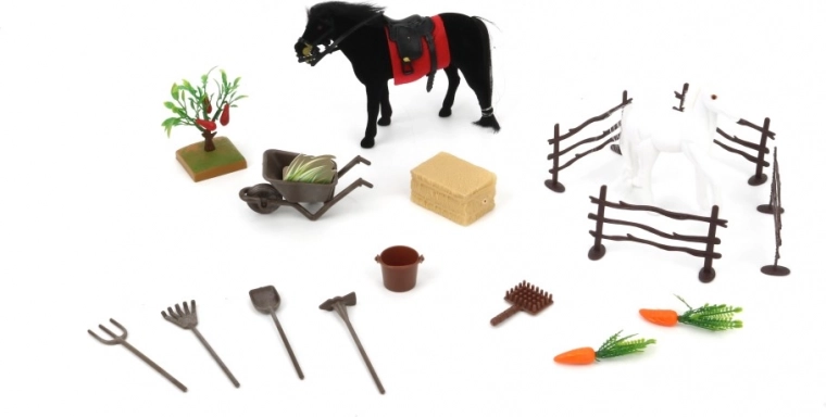 Setul include tot ce este necesar pentru a crea propria fermă de cai, incluzând figurine de cai, instrumente agricole și legume.