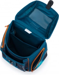 Echiparea gândită facilitează fiecare zi de școală: compartiment principal cu separator, etichetă cu nume și orar pentru o vedere de ansamblu perfectă, buzunar frontal pentru cutia de gustare și buzunare laterale cu fermoar. Baza rigidă impermeabilă cu piciorușe asigură stabilitate și rezistență. Vizibilitatea excelentă este asigurată de elementele reflectorizante dispuse pe conturul rucsacului.