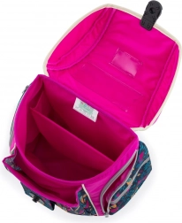 Compartimentarea interioară inteligentă cu organizer, spațiul principal mare și numeroasele buzunare păstrează ordonate rechizitele școlare. Închiderea magnetică simplă ușurează utilizarea zilnică. Setul este completat de un săculeț practic pentru sport/pantofi de schimb cu închidere prin șnur și de un penar cu un singur etaj, două clapete (fără conținut), cu bucle elastice și folie transparentă pentru orar.