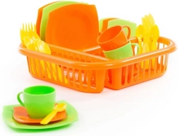 Cu acest set de veselă colorat fiecare copil va descoperi rapid farmecul gătitului și curățeniei. Setul este ușor și adaptat mâinilor mici ale copiilor, ceea ce îl face o jucărie ideală pentru cei mai mici. Lăsați copiii să se bucure de un joc realist în bucătărie: să pregătească prânzul și apoi să facă curățenie ca prin farmec. Toate componentele sunt fabricate din plastic, ceea ce facilitează manipularea și este sigur.