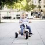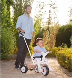 Tricicletă pentru copii ușoară și stabilă, în eleganta culoare bej, cu cadru metalic, bară de ghidare cu 3 niveluri de înălțime, pedale antiderapante cu blocare și centură de siguranță. Datorită scaunului ergonomic ajustabil, rotițelor silențioase și coșulețului rabatabil practic, este ideală atât pentru primele plimbări, cât și pentru ghidarea confortabilă de către un adult.