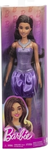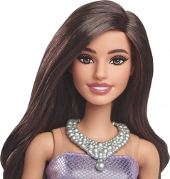 Păpușa Barbie are părul castaniu lăsat lejer în bucle și aspectul său este completat de detalii amuzante, cum ar fi un colier argintiu și pantofi cu curele asortate. Este pregătită pentru evenimente sclipitoare în rochia sa mov de tip bubble! Corsetul fără bretele sclipeste cu un imprimeu de paiete, iar fusta din satin adaugă multe volane amuzante.