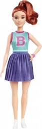 Păpușa poartă o ținută sport-casual, care include un tricou turcoaz și o fustă plisată mov, ideală pentru experimente de modă.