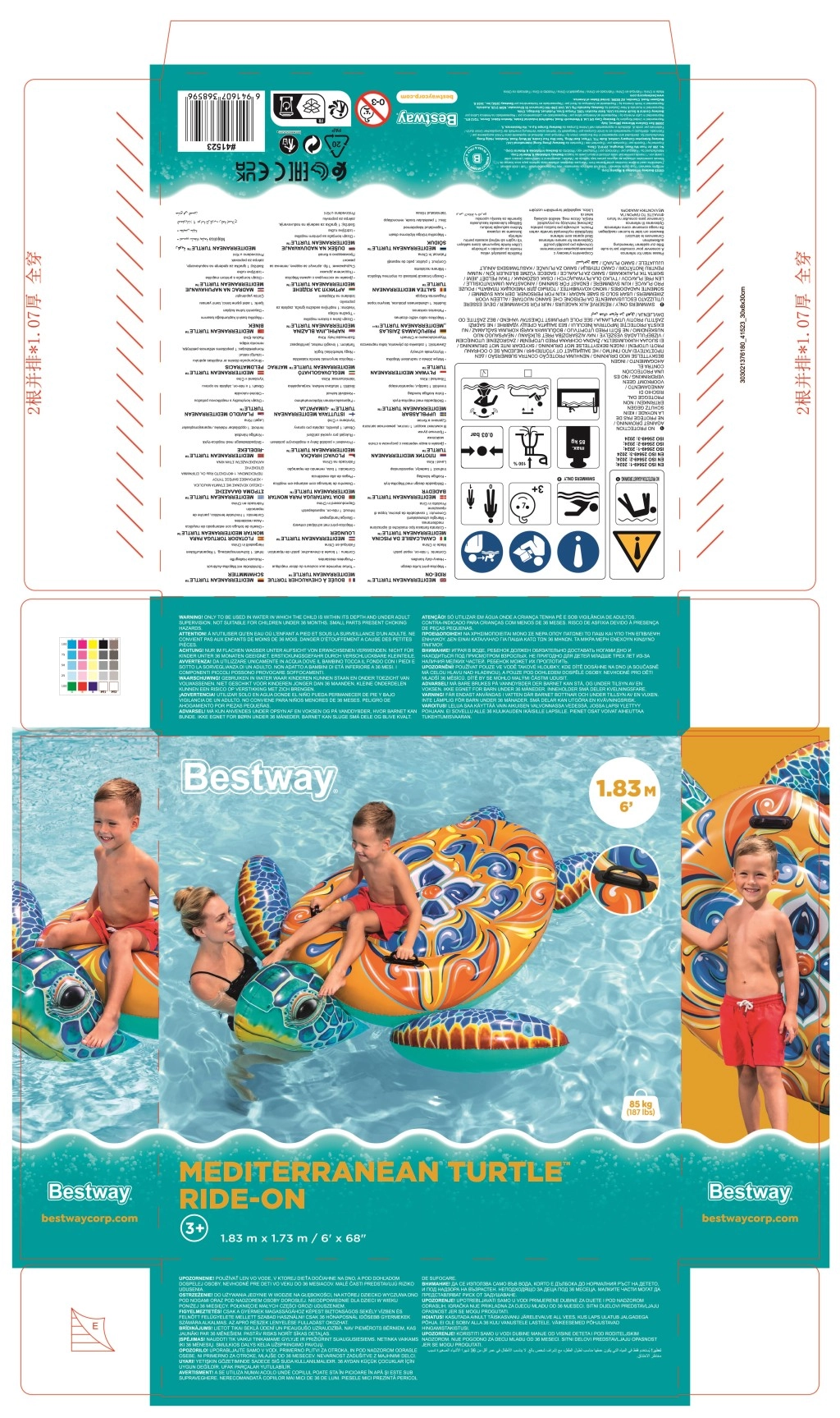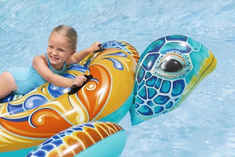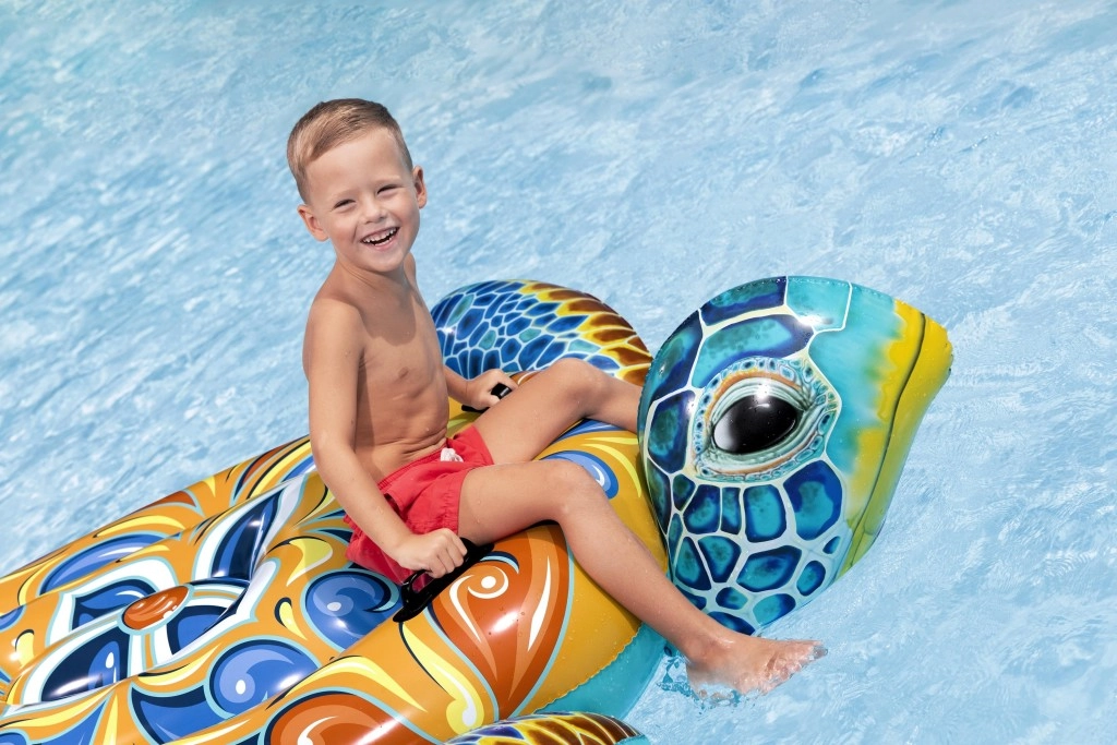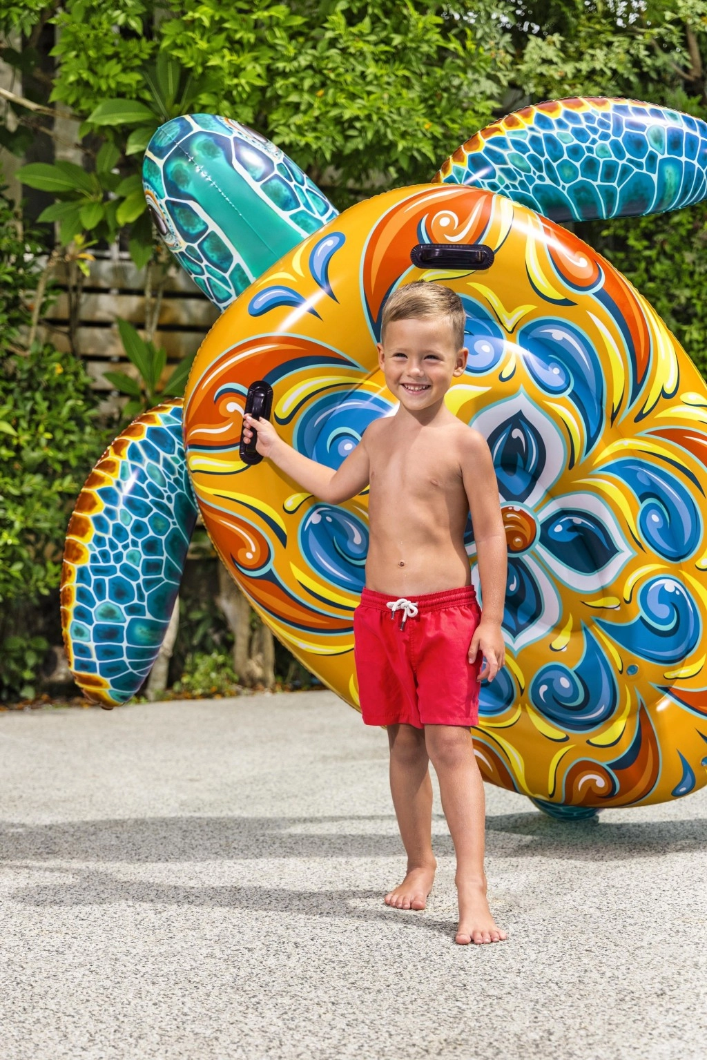 Țestoasa gonflabilă Bestway cu imprimeu accentuat Majolika este alegerea ideală pentru distracție pe apă. Datorită dimensiunilor generoase de 183 × 173 cm, oferă un spațiu confortabil pentru întins și plutit, în timp ce cele două mânere integrate asigură o prindere sigură și stabilitate la urcare și în timpul jocului.