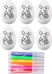 Setul conține 6 ouă și 6 markere colorate – galben, portocaliu, roșu, albastru, roz și verde – astfel încât puteți începe imediat. Activitatea creativă susține motricitatea fină, coordonarea mână–ochi și imaginația copiilor.