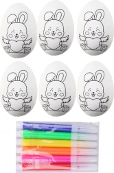 Set creativ pentru copii și adulți: 6 ouă din polistiren cu un motiv drăgălaș de iepuraș și markere colorate. Ideal pentru creații de Paște, proiecte școlare și distracție acasă. Suprafață netedă pentru pictat ușor, dezvoltarea motricității fine și stimularea imaginației la decorarea propriilor ouă încondeiate.