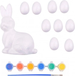 Setul nostru de Paște este ideal pentru copiii care vor să creeze și să descopere. Conține 9 ouă din polistiren și o figurină de iepuraș, care, datorită suprafeței netede, pot fi ușor pictate și decorate. În pachet veți găsi, de asemenea, 6 nuanțe de culori – roșu, galben, verde, albastru, alb și negru.