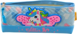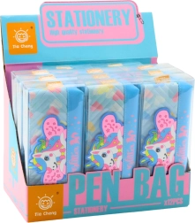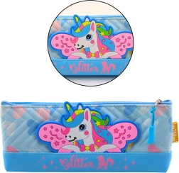 Aparat pentru articole de papetărie albastru cu motiv de unicorn este ideal pentru păstrarea materialelor de școală. Este fabricat din imitație de piele, moale, rezistent și respectă normele de siguranță CE și EN71.