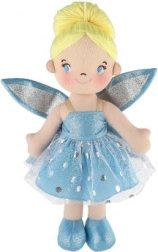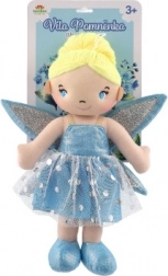 Păpușa este îmbrăcată în rochie albastră cu aripi sclipitoare, oferindu-i un aspect de basm adevărat.