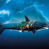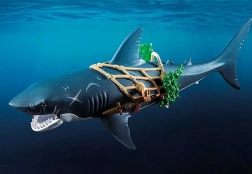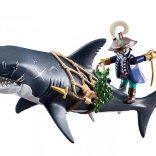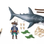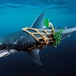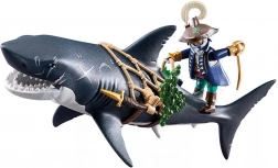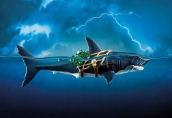 Rechinul uriaș cu pirat de la PLAYMOBIL aduce copiilor povești captivante din adâncurile oceanului. Doar trage de pârghie și gura gigantică se deschide, pregătită să „prindă” prada; după eliberare se închide automat. Figurină pirat se ține de plasă, este înarmată cu sabie și pumnale și este gata pentru orice încăierare pe mare.