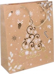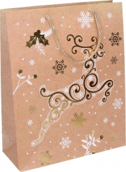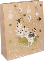 Pungă cadou stilată, mărimea M, cu dimensiunile 26 × 32 × 10 cm, ideală pentru împachetarea cadourilor de Crăciun. Oferă 4 motive diferite de Crăciun, execuție robustă și mânere practice pentru purtare comodă.