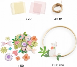 - 1 inel de bambus (18 cm), 20 foi de hârtie de mătase (2 nuanțe), 3,5 m fir de rafie împletit, 59 modele ilustrate pre-perforate și 1 set de instrucțiuni pas cu pas.