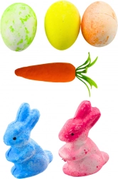 Această set conține ouă colorate, iepurași și morcovi, oferind un aspect clasic de Paște.