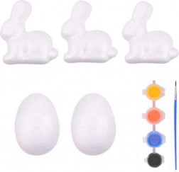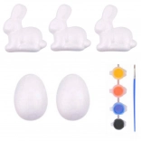Setul conține trei iepurași din polistiren și două ouă din polistiren. Include, de asemenea, patru culori intense și o pensulă care permit o pictură ușoară și precisă.
