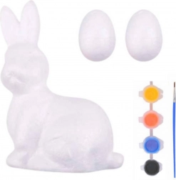 În acest set creativ veți găsi un iepure din polistiren și două ouă din polistiren. Datorită culorilor incluse în nuanțe intense și a pensulei, pictatul devine o activitate ușoară și plăcută. Acest set dezvoltă creativitatea și abilitățile manuale, permițând crearea de ornamente unice pentru masa de Paște, coronițe sau coșuri. Figurinele finale vor fi o parte frumoasă a atmosferei de sărbătoare care conferă interiorului o dispoziție de primăvară excepțională.