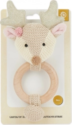 Adorabila căprioară de la Bieco combină zornăitoare, jucărie de apucat și inel pentru dentiție într-un singur produs. Lemnul natural și țesătura moale din bumbac oferă un contrast plăcut pentru dezvoltarea senzorială, zornăitul delicat stimulează auzul, iar inelul de dentiție ameliorează disconfortul la erupția primilor dinți.