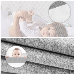 Șina superioară rabatabilă simplifică utilizarea zilnică – vă puteți întinde, ridica și verifica ușor bebelușul adormit. Plasa respirabilă asigură circulația aerului și vizibilitatea asupra copilului, iar materialul durabil este ușor de spălat. Nu lipsește buzunarul lateral pentru suzetă, șervețele sau jucării mici.