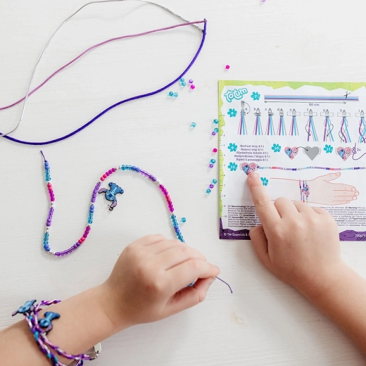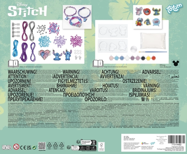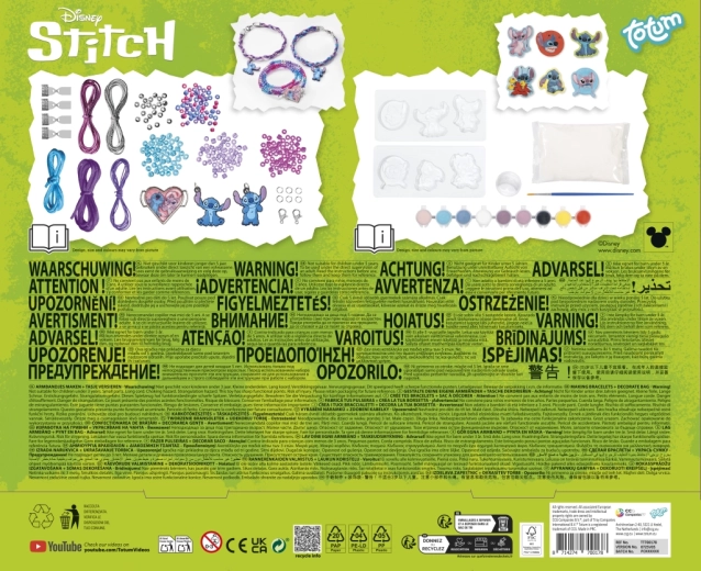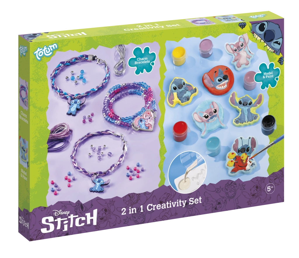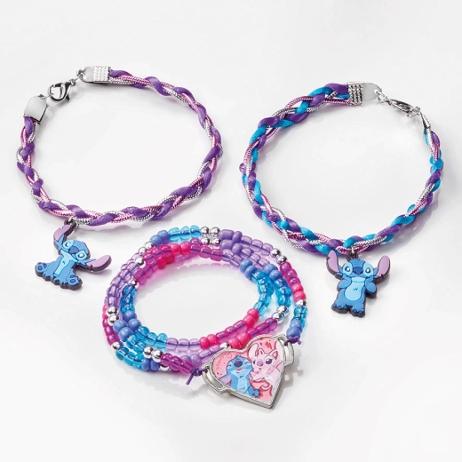 Această set creativ uimitor îți oferă oportunitatea de a-ți exprima creativitatea și de a crea accesorii unice. Folosind sfori de satin în culori vibrante poți crea brățări împletite stilate, completate cu pandantive de cauciuc premium cu Stitch. Aceste pandantive vor da brățărilor tale un aspect jucăuș și unic. În plus, poți crea o brățară elegantă cu mărgele ce conține mărgele de sticlă colorată și mărgele rotunde argintii. Brățara ta va fi încheiată cu un pandantiv mare în formă de inimă cu imaginea lui Stitch și Angel.