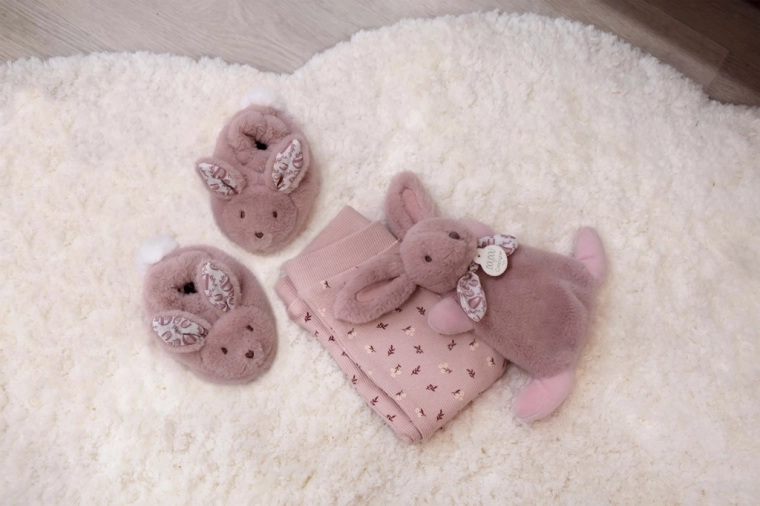 Oferiți moliciune și siguranță cu acest set minunat. Iepurașul de pluș cu o fundă elegantă aduce un sentiment de calm și susține dezvoltarea simțului percepției la copii. Botoseii cu urechi lungi păstrează căldura datorită materialului cald, având fața iepurașului brodată pe partea din față.
