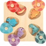 Sub ouăle colorate de dinozaur ascunzi figurinele corespunzătoare. Copiii se pot juca precum cu un puzzle clasic sau își pot antrena memoria găsind perechile.