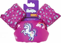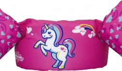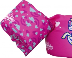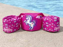 Motivul roz cu unicorn, inimioare și curcubeu îi motivează pe copii să se joace în apă și le crește încrederea în sine în timpul învățării înotului.