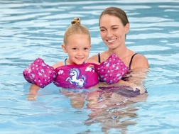 Atenție: Nu este o vestă de salvare. Folosiți doar în apă în care copilul atinge fundul și întotdeauna sub supravegherea constantă a unui adult.