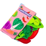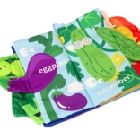Cărticica textilă moale pentru cei mai mici dezvoltă simțurile și motricitatea fină și, în același timp, îi învață primele cuvinte. Ilustrațiile colorate cu legume, pagini foșnitoare și elemente piuitoare o transformă într-o jucărie educativă distractivă, potrivită acasă și în călătorii. Pe pagini se află denumirile legumelor în engleză, ceea ce susține învățarea prin joc.