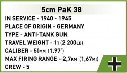 Sunt incluse două figurine (mecanic german și artilerist), tun de câmp de 5 cm Pak 38 și un indicator EL ALAMEIN inspirat de fotografii istorice. Setul este fabricat în UE, respectă normele de siguranță și este pe deplin compatibil cu alte mărci de cărămizi de construcție.