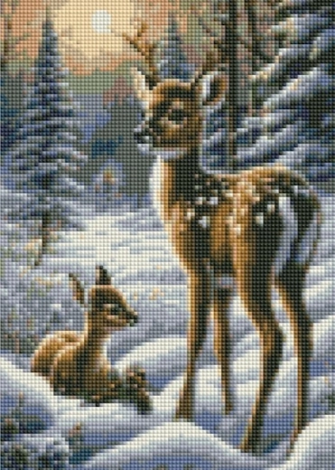 Pictura cu diamante este un hobby creativ și relaxant pentru copii și adulți. Cu ajutorul stiloului de aplicare așezi mici pietricele pe o pânză autoadezivă, tipărită în prealabil, obținând astfel o imagine sclipitoare cu căprioare în pădurea înzăpezită. Nu este necesară nicio experiență anterioară – este suficient să urmezi legenda inclusă.