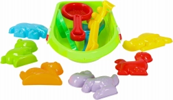 Acest set universal de jucării pentru nisip și apă oferă copiilor multe oportunități de a-și dezvolta creativitatea. Setul include un pat, șase forme în formă de animale, două tipuri de lopeți, greble și o sită, care permit turnarea nisipului și construirea de castele.