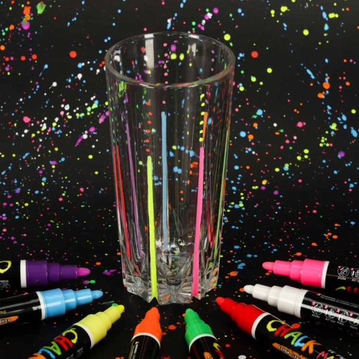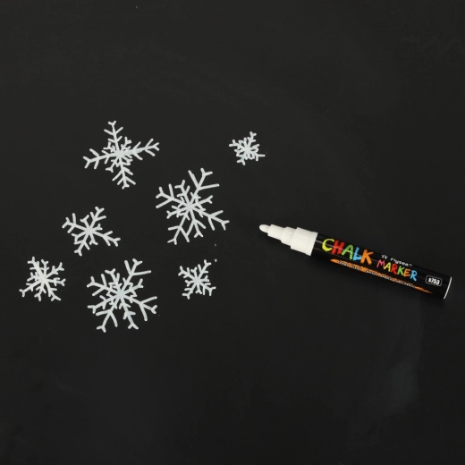 Fiecare marker are un vârf dublu (rotund și înclinat), care poate fi rotit după nevoie, asigurând precizie și diversitate liniilor create. Cerneala pe bază de cretă și apă nu lasă urme; este suficient să folosiți o cârpă umedă pentru a-l îndepărta – fără pete și reziduuri. De asemenea, nu murdărește mâinile și nu produce praf ca creta tradițională.