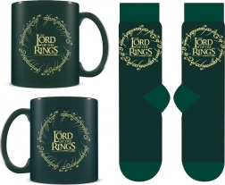 Set cadou stilat pentru fanii Stăpânul Inelelor, conține o cană ceramică cu volum de 315 ml și șosete confortabile mărimea 41–45. Cana este potrivită pentru mașina de spălat vase și cuptorul cu microunde, iar șosetele sunt din material plăcut cu adaos de elastan pentru elasticitate mai bună.