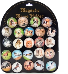 Set decorativ de 24 de magneți cu motive de câini, pisici și cai, care va încânta copiii și iubitorii de animale. Fiecare magnet are aproximativ 4 cm, livrat pe o tablă magnetică cu suport cu dimensiunile aprox. 22 × 27 cm. Ideal ca decorațiune pentru frigider, tablă sau birou.