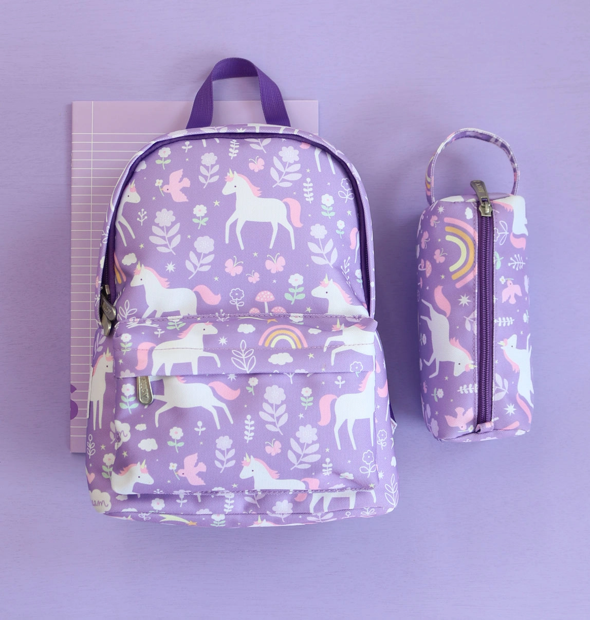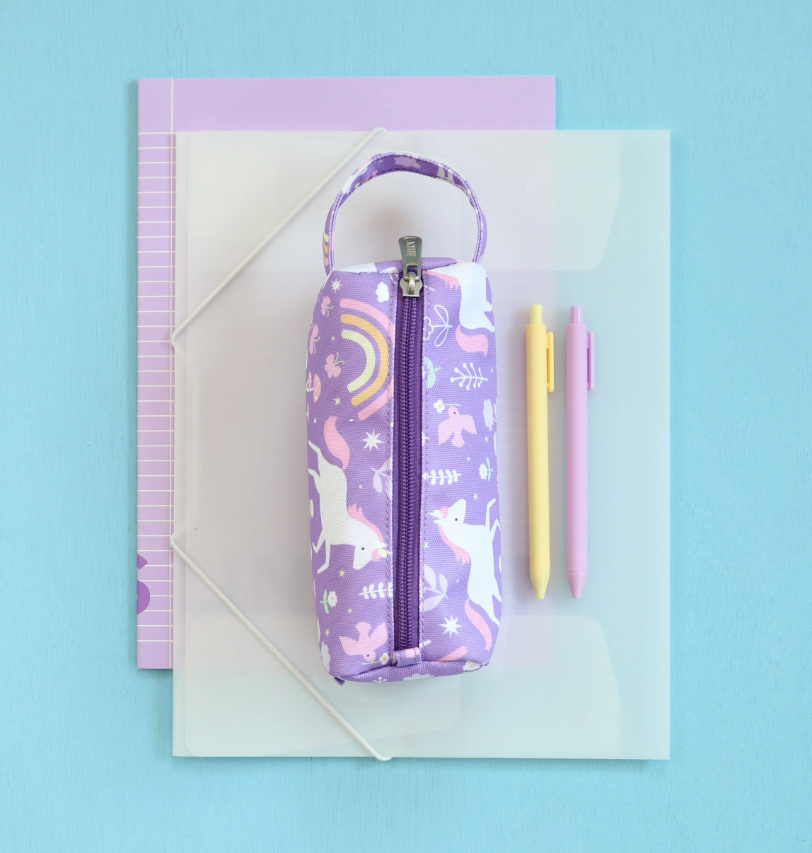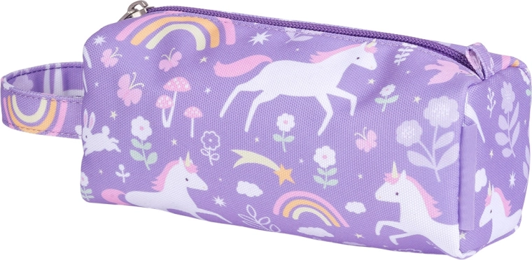 Pernă mov pentru creioane, carioci sau ustensile de scris cu motive de unicorni, flori și curcubeu, este fabricată din poliester sustenabil. Ideală pentru școală, călătorii sau activități extrașcolare, se închide cu fermoar și are un mâner confortabil pentru transport ușor. Asigură depozitarea în siguranță a ustensilelor dumneavoastră de scris.