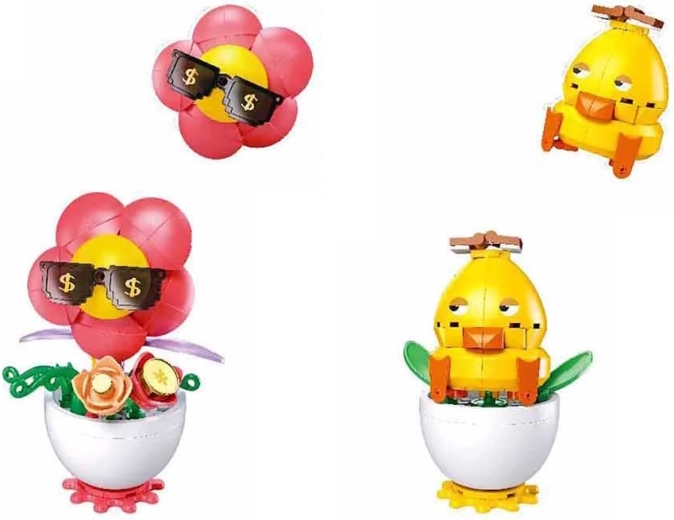 Construiți șase „flori” colorate cu expresii amuzante și accesorii – de la ochelari de soare la forme fanteziste. Ideal pentru birou, raft și pervaz.