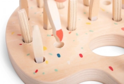Prin introducerea și scoaterea pensulelor de lemn, copiii își dezvoltă motricitatea fină. Designul ergonomic facilitează manipularea.