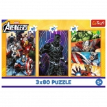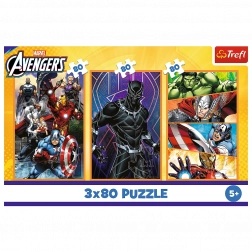 Puzzle 3x80 Zile de Acțiune prezintă scene uimitoare cu supereroii îndrăgiți Avengers precum Captain America, Black Panther, Thor, Iron Man și Hulk. Fiecare puzzle, după asamblare, creează o imagine cu dimensiunile de 275x180 mm.