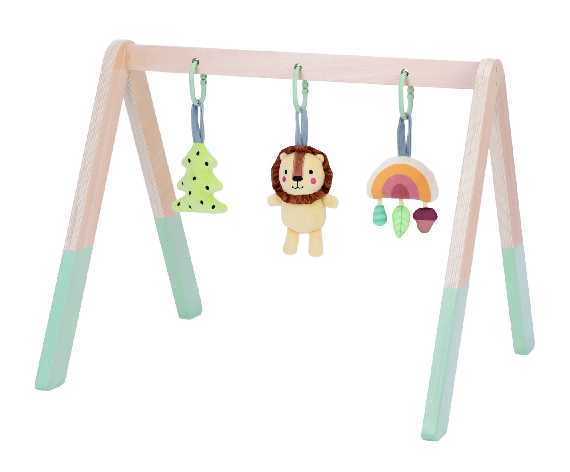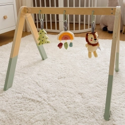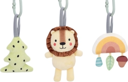 Setul include o agățătoare colorată în formă de „brăduț” cu efect de foșnet, un leu drăguț cu zornăitoare și clopoțel și un curcubeu sclipitor cu trei elemente mai mici, cu texturi și culori diferite, care la apăsare piuie. Totul este realizat în culori pastelate și vopsit cu vopsele sigure, potrivite pentru copii.